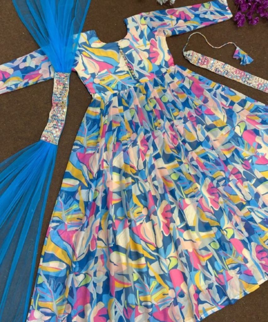 Gown Work : Digital Print With Sequins And Revat Moti Work Belt (3 Mtr Flair)