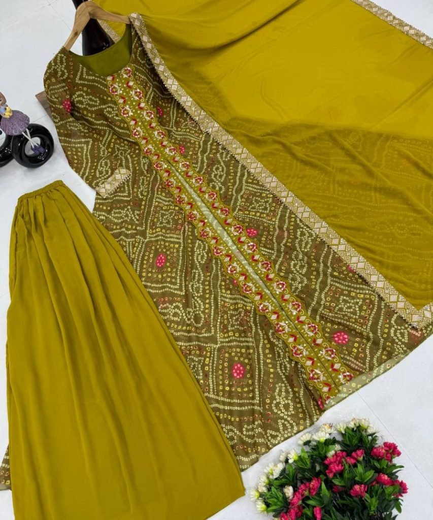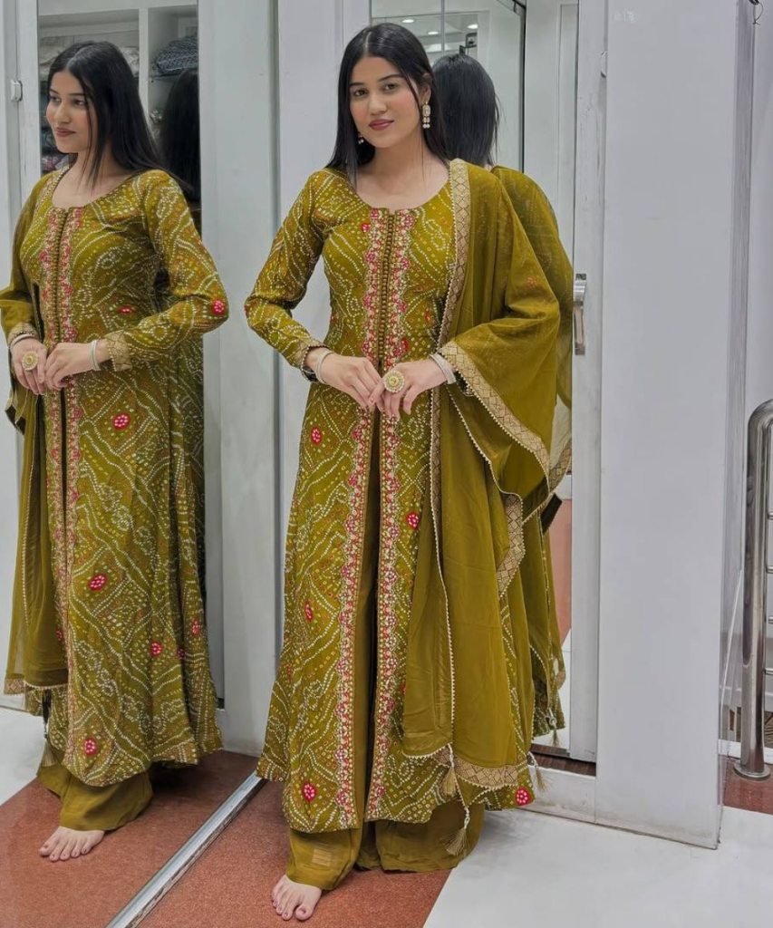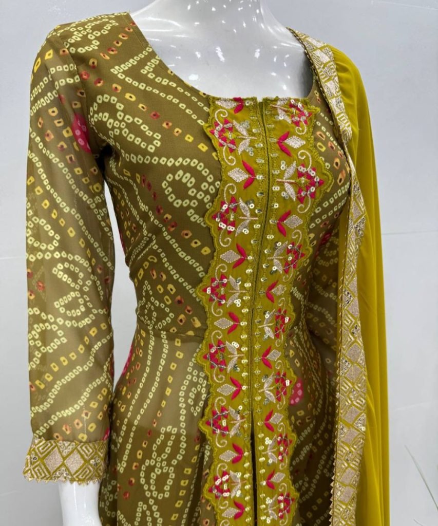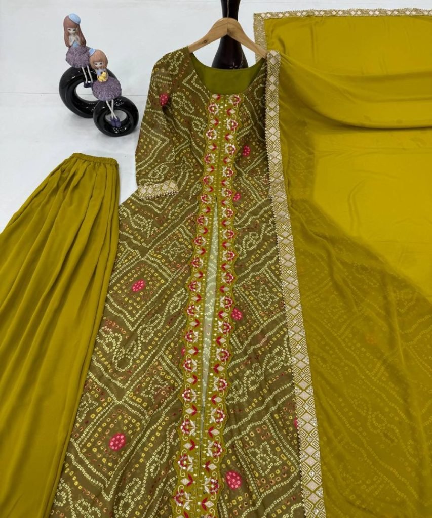 Top Work : Fancy Digital Print With Embroidery Sequins Work And Amrela Cut 5 Mtr Flair