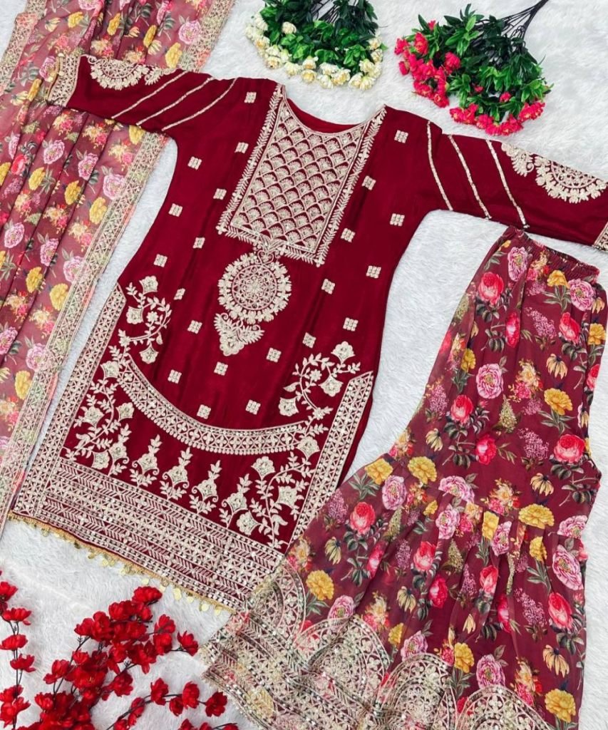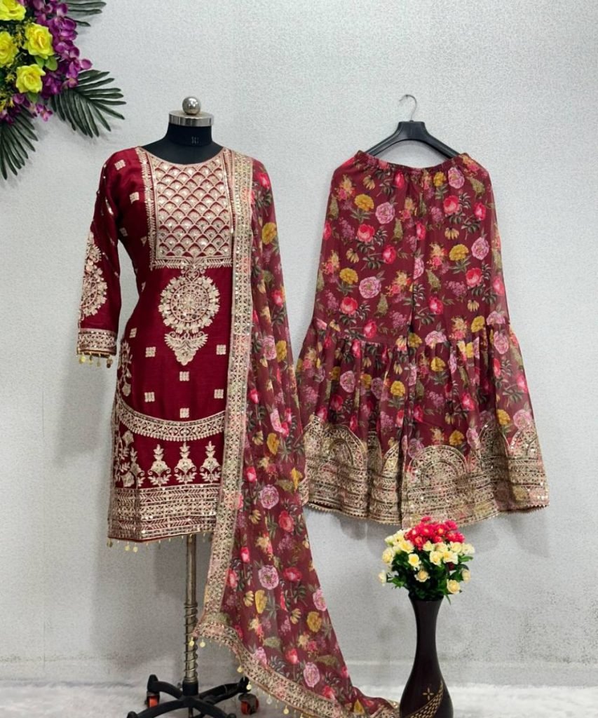 Plazzo Work : Chine Sequins Work With Digital Print And Samosa Less